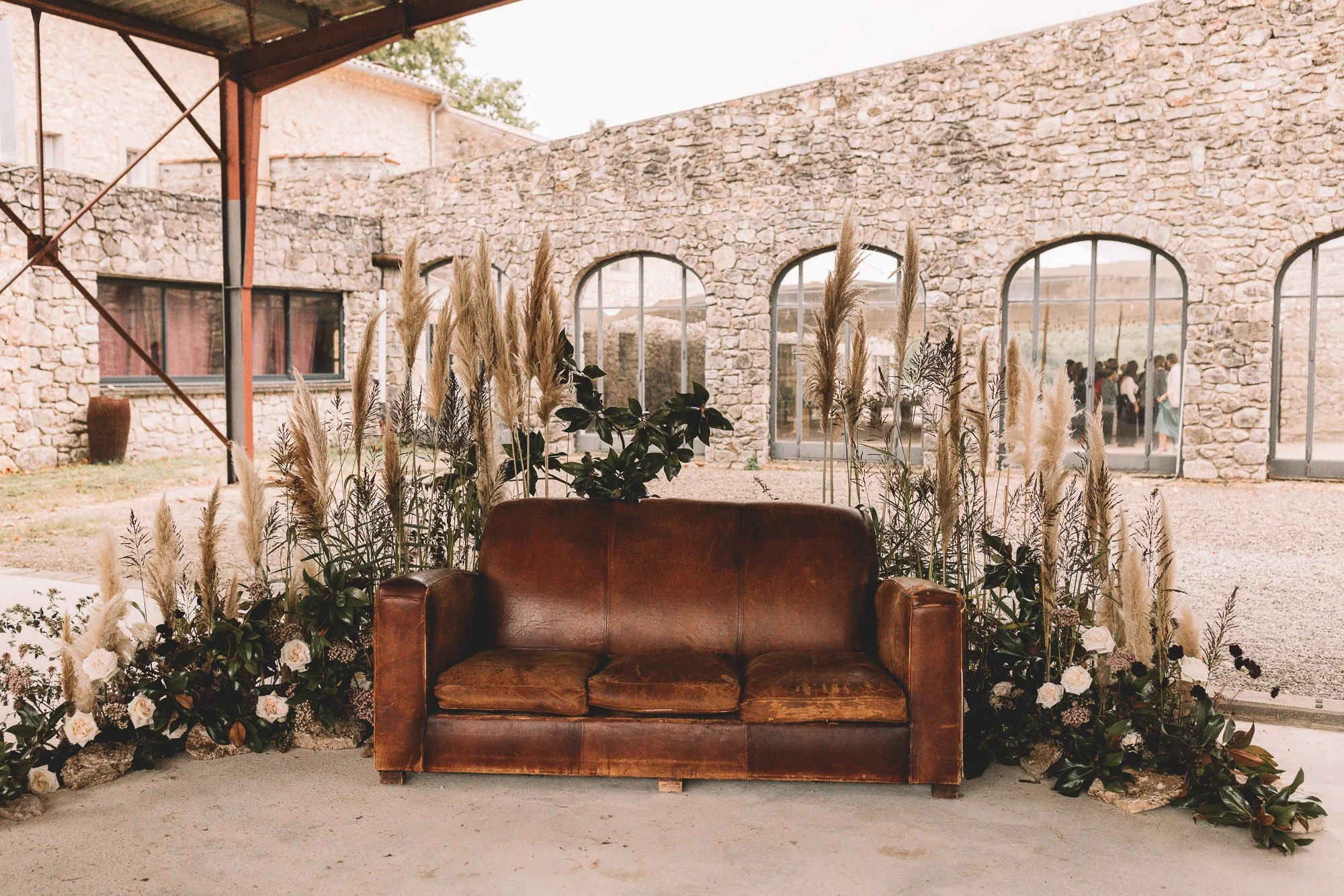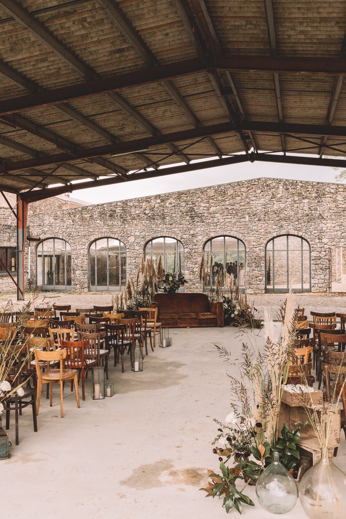 Lorsque je suis tombé sur le hangar ouvert qu’ils ont derrière le domaine, près de la piscine, j’avais trouvé LE lieu de notre cérémonie laïque : un sol brut, une structure en acier… Avec en plus, une vue sur de belles arches d’un côté, sur la nature de l’autre…