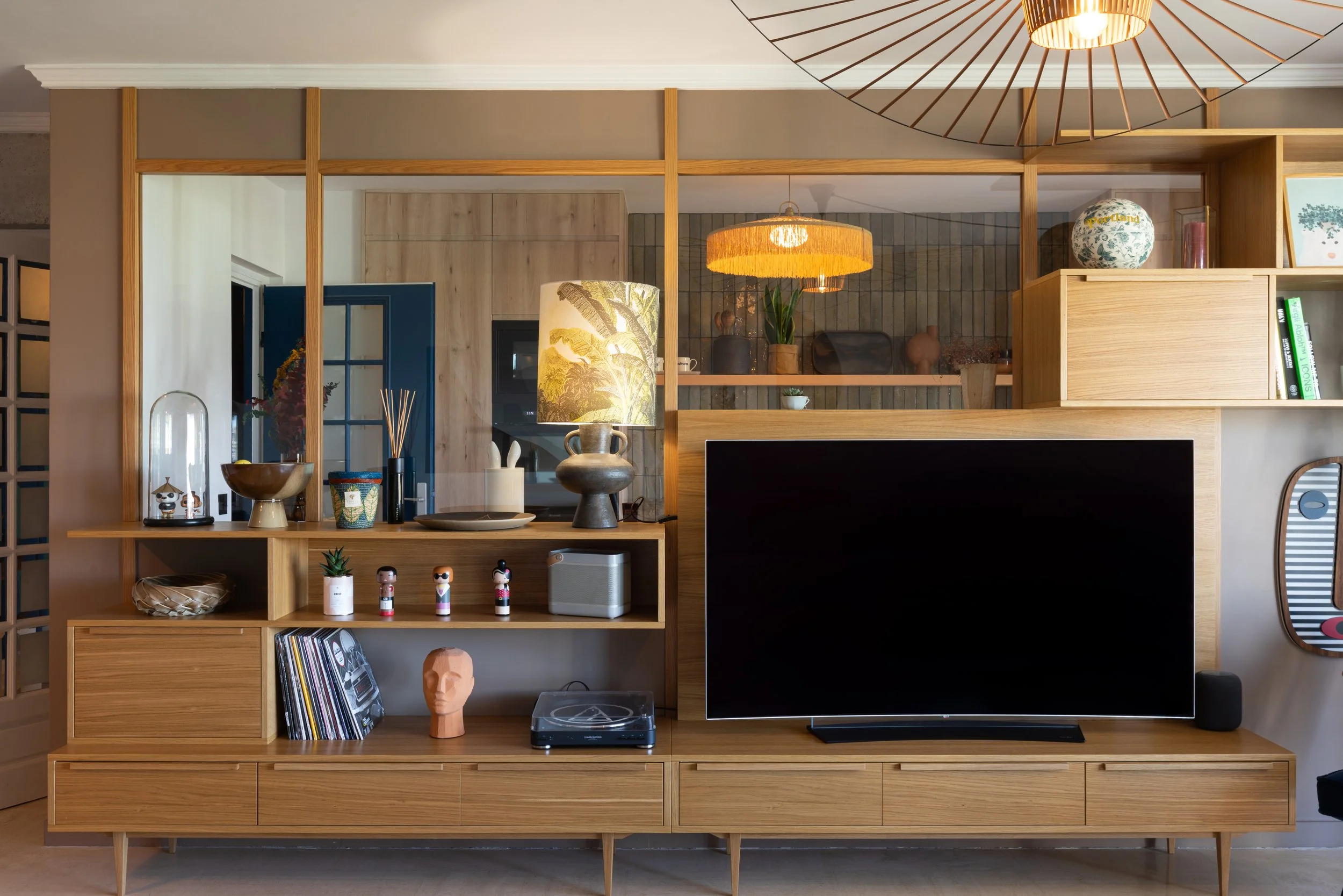 Celui-ci se compose de tiroirs de rangement sur la partie basse, de deux portes de type bar ainsi que de diverses niches et étagères pour exposer de beaux accessoires de décoration, nos vinyles les plus chers à notre cœur ainsi que de beaux livres !