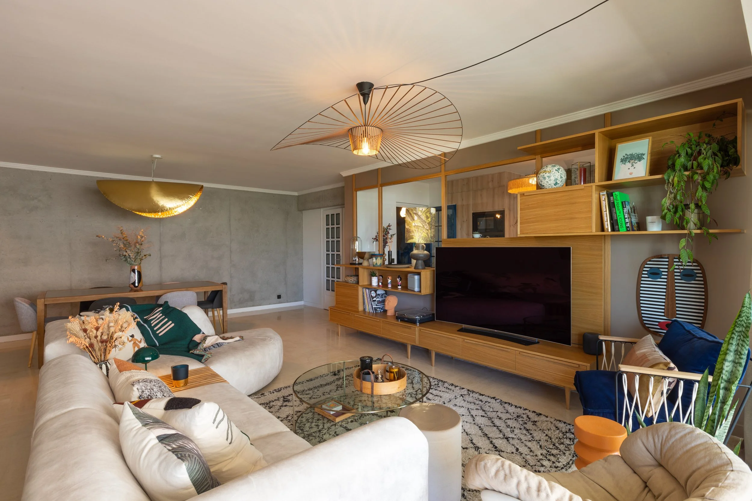 Mur en béton, formes de couleurs au mur, verrière et meuble télé sur-mesure,… Ces choix audacieux n’auraient pas été imaginés sans les idées et la créativité de France Bittel et Olivier Chanard, les fondateurs de BleuGris; un couple qui fait partie de mes coups de cœur amicaux depuis que je les ai rencontrés au sein de leur boutique de décoration, niçoise, Cobalt.