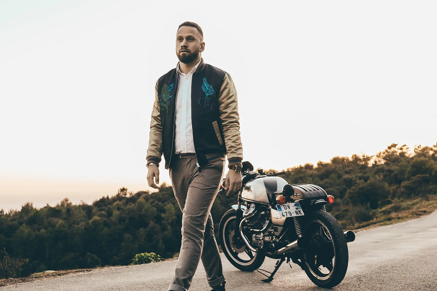 Pour les besoins du shooting, j’ai forcément opté pour un look de dandy biker avec un bombers ainsi qu’un pantalon de la marque Commune de Paris, l’une de mes favorites.