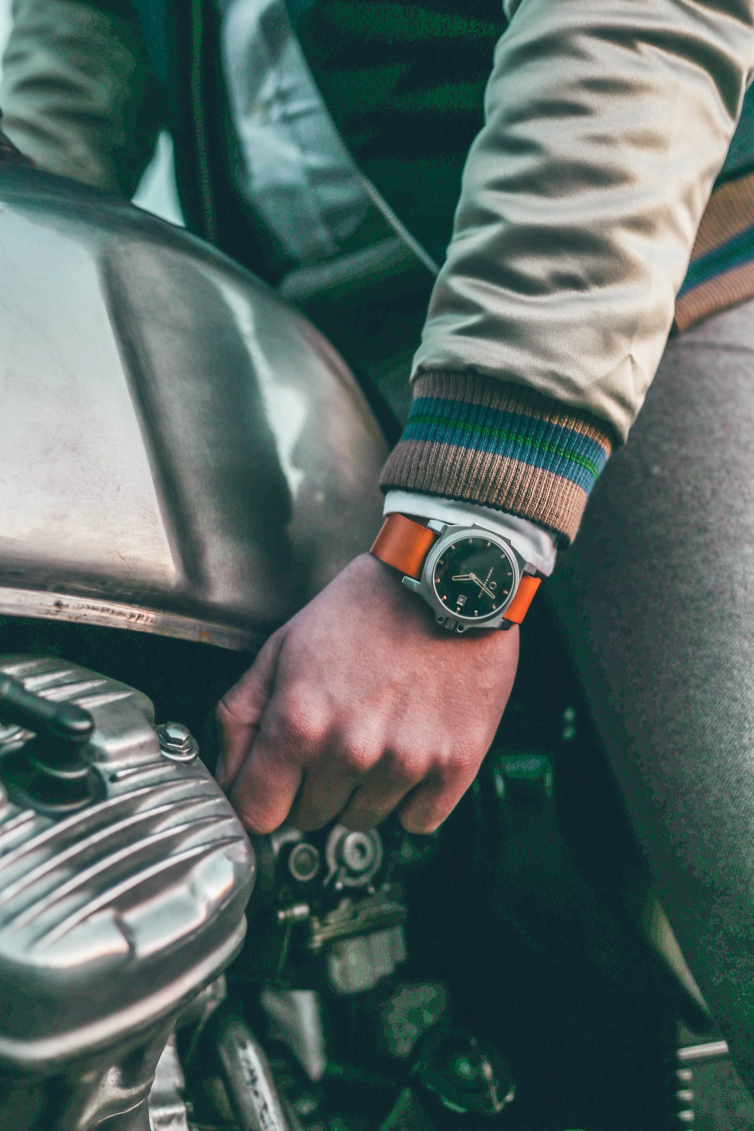 La montre est esthétiquement sublime, résolument masculine et fait assurément penser à l’univers mécanique de la moto. La lunette moletée en pointe de diamant est inspirée des poignées de gaz. Le boîtier de la montre reprend la forme du circlips. Et les aiguilles parcourent le temps ce que celles des cadrans des motos filent des kilomètres.