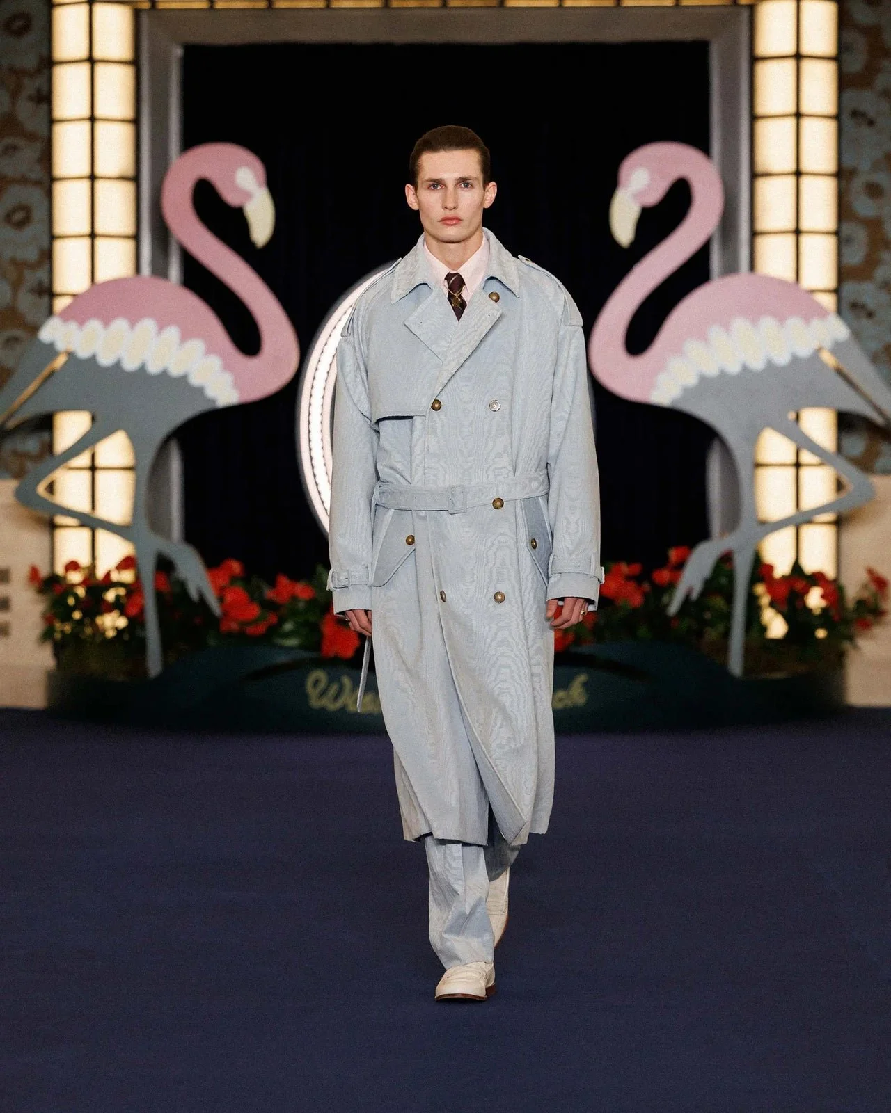 La collection Automne – Hiver 2026 de Drôle de Monsieur se dévoile dans un décor marqué par la présence de deux flamants roses, clin d’œil au Pink Flamingo, l’un des tout premiers hôtels-casinos de luxe de Las Vegas. Dans l’imaginaire de la maison, cet emblème iconique vient illuminer le logo de la marque, tel un néon vibrant au cœur de la nuit.