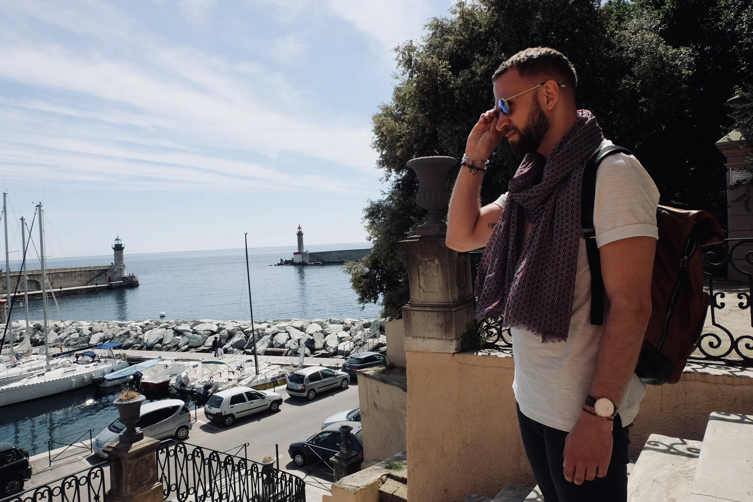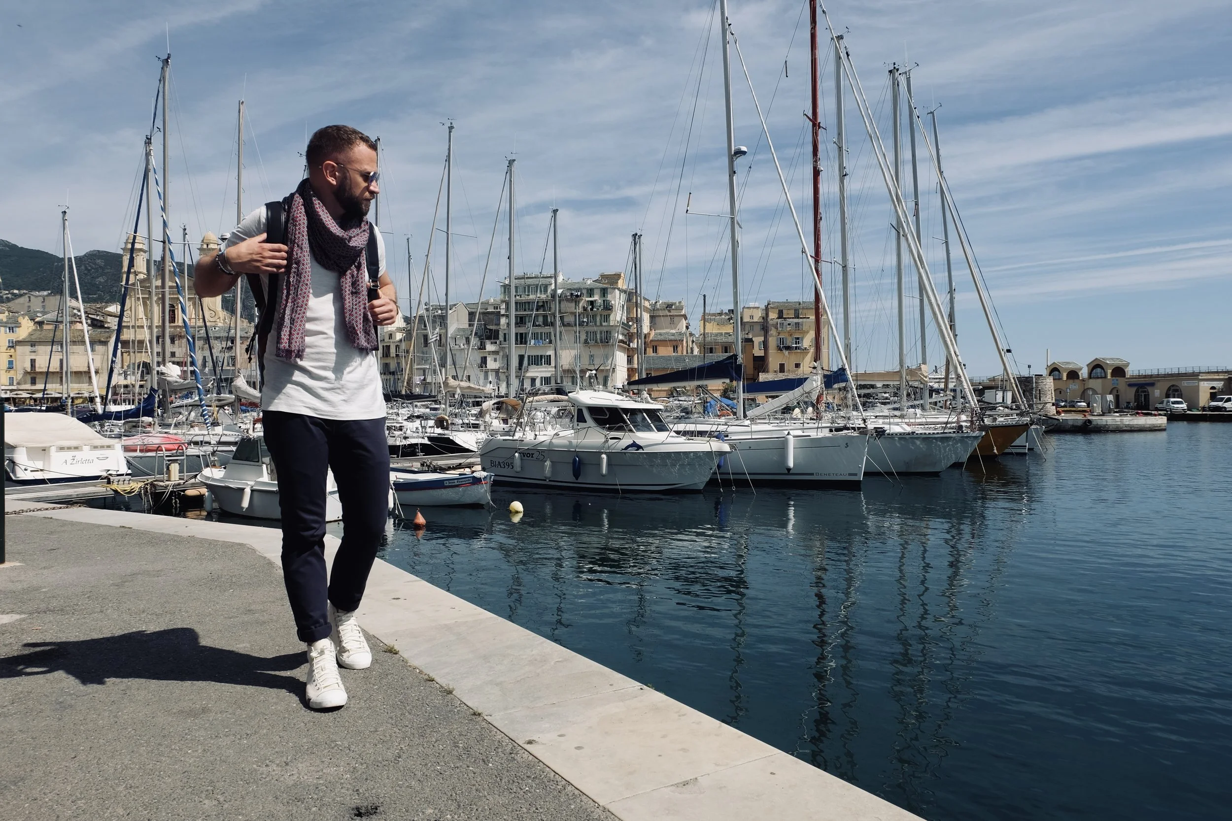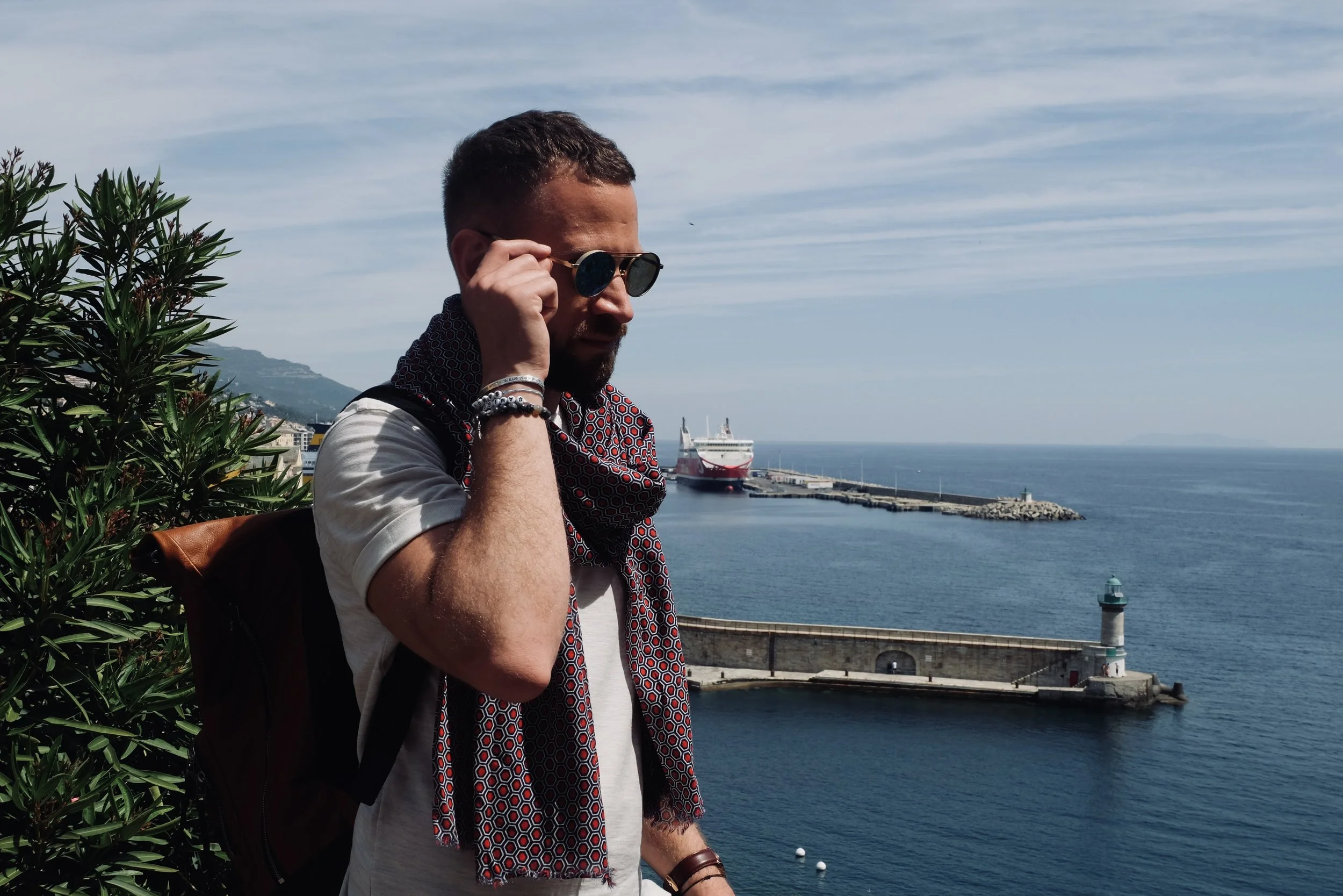 Et on commence tout de suite avec la marque que vous préférez sur ce blog (oui, je vous connais !). Nous l’avons vu sur mon dernier look, Monsieur Charli propose désormais d’élégants et robustes tote bags en toile de coton, inspirés de l’univers motocycliste. Toutefois, Monsieur Charli reste le grand spécialiste du foulard masculin. Fidèle à elle-même, Virginie Lepron, la créatrice, m’a totalement séduit avec la collection Printemps / Été 2017. Cette saison, j’ai craqué sur 2 modèles : le patchwork en viscose que vous avez pu apercevoir sur l’affiche de l’événement pour l’anniversaire du blog ainsi que celui-ci, le nid d’abeille en coton. Et j’ai bien fait d’emmener mon nouveau foulard Monsieur Charli pour ce séjour. En effet, le dernier jour, le vent s’est levé sur Bastia et lorsque le vent souffle à Bastia, il ne fait pas semblant… Mon foulard s’est ainsi avéré très pratique !