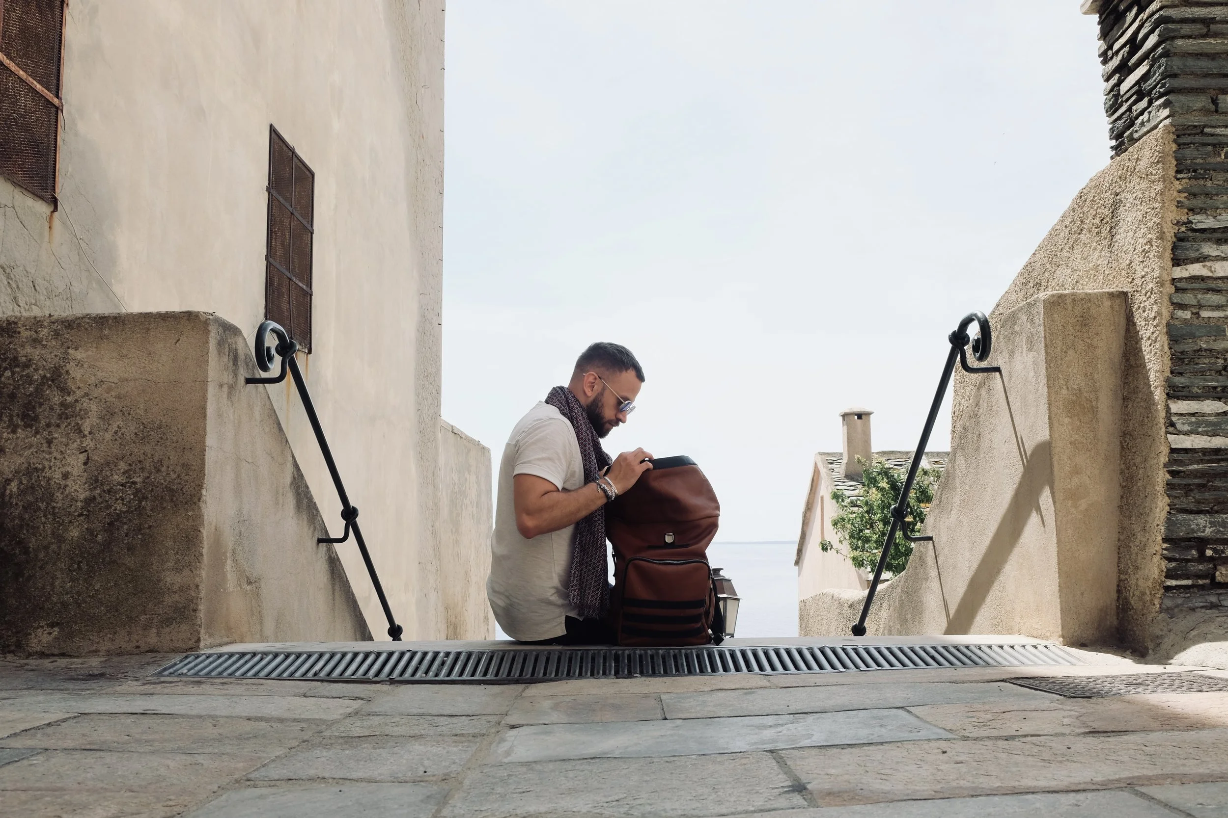 Passons aux accessoires… Pour assurer ce séjour en Corse, il me fallait un sac à dos pratique et assez grand pour contenir mon appareil photo, mes carnets de voyage, mes chargeurs de téléphone et autres ustensiles indispensables à un blog trip réussi ! Assurément, il était hors de question de dénaturer le style. J’ai ainsi dégoté ce modèle de la marque Fossil. J’ai été agréablement surpris par son look baroudeur, propice à un séjour de découvertes. Il est pratique car il est grand et se ferme à l’aide d’un clips présent sous la sangle. Au début, j’ai cru qu’il fallait enlever et remettre la ceinture à chaque fois pour l’ouvrir. Ce n’est pas le cas, l’ouverture du sac est ingénieusement pensée pour se faire rapidement. Ce sac à dos Fossil est également muni de plusieurs pochettes intérieures : une dans la poche principale et 2 dans la poche avant qui, elle, est zippée. Sa couleur camel, lumineuse, peut matcher facilement avec bon nombre de vêtements.